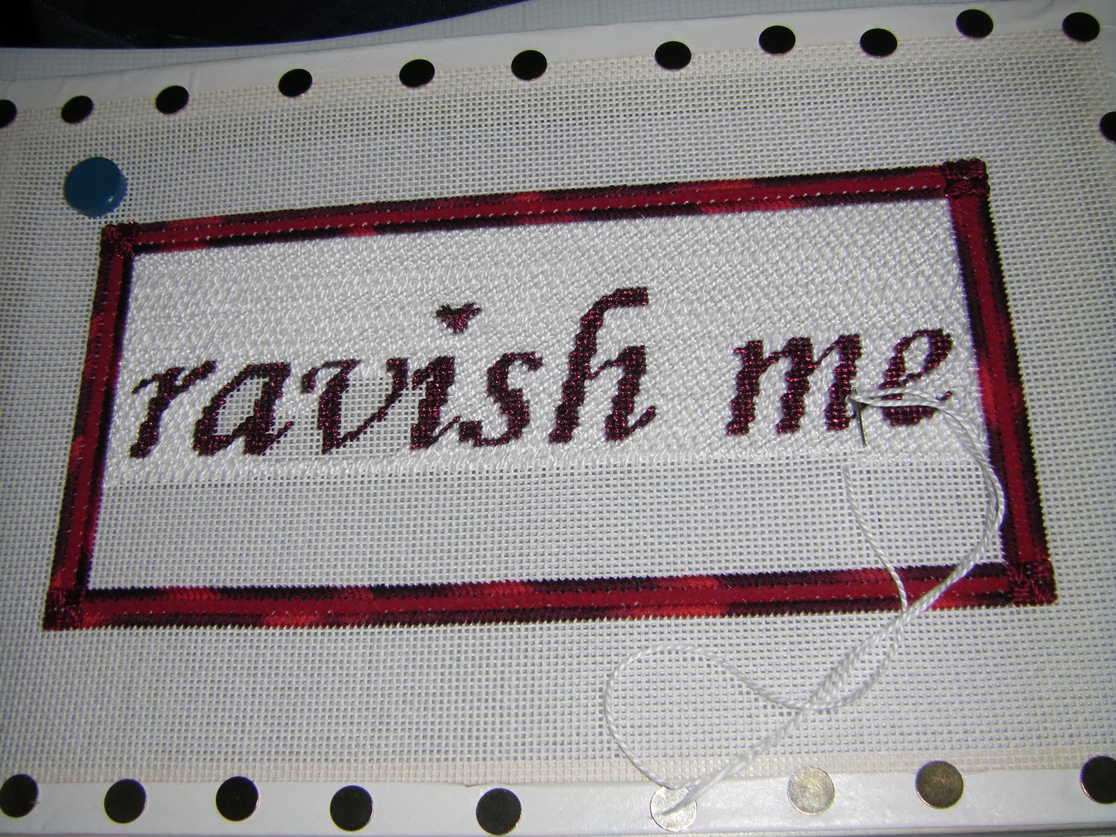 This freed me, both mentally and physically, to stitch on other things. Here's the progress on my Ravish Me canvas. I am so happy that I got the compensation around the letters correct and everything matches as it should. I realize that this is not my best technical work. And I don't care. I got this canvas from someone giving it away. I kitted with stuff from my stash, but now I need another skein of pearl cotton.